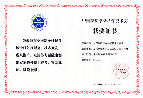2005年1月,冰輪“新系列螺桿制冷壓縮機研究與開發”榮獲中國制冷學會科技進步一等獎。